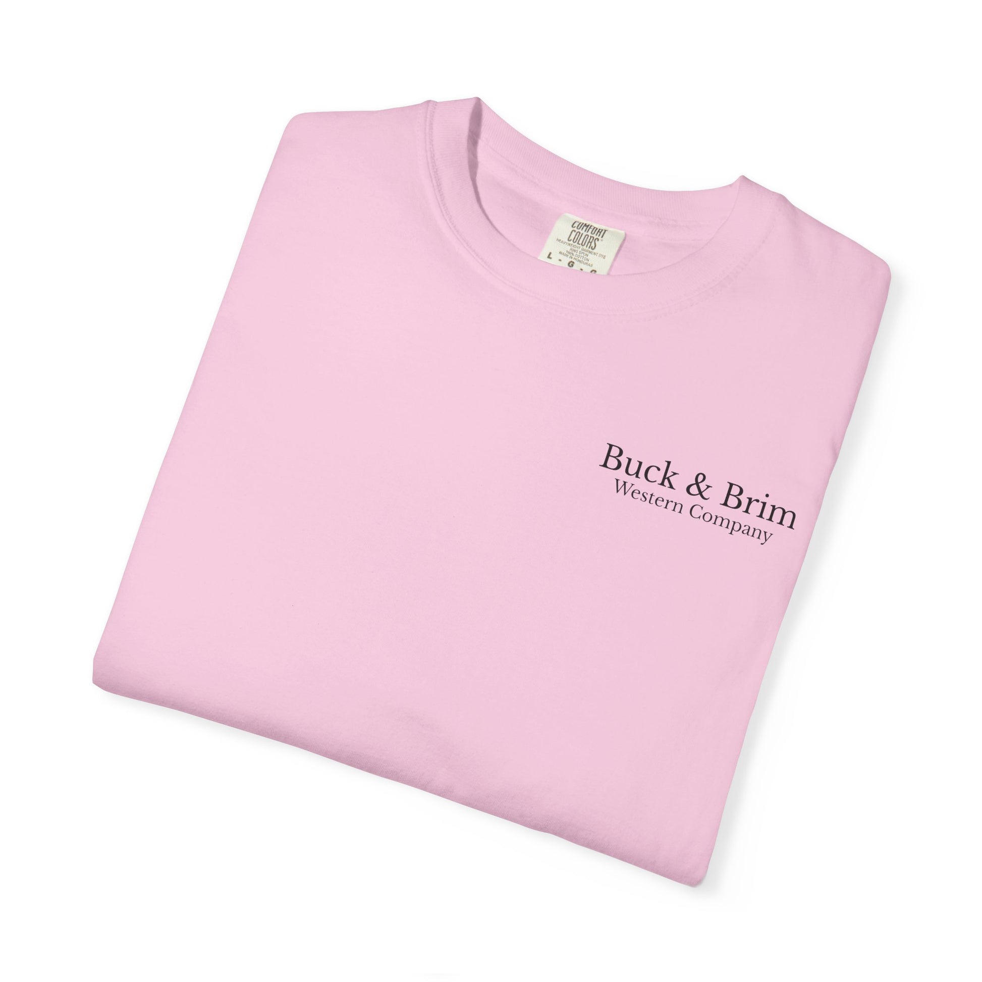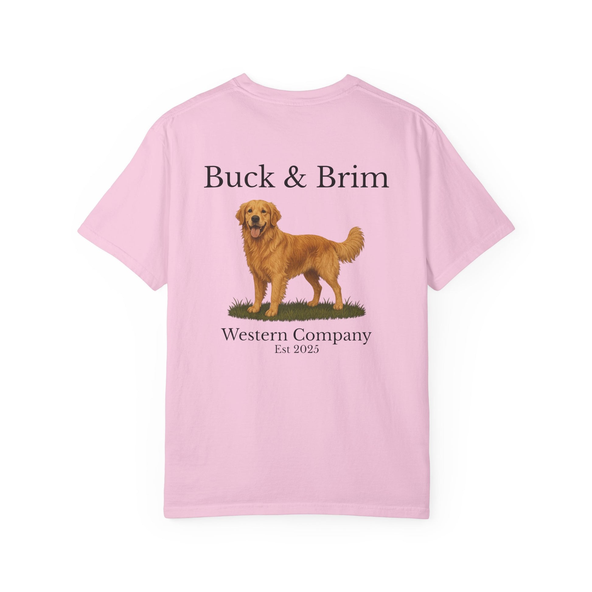 This Buck & Brim t-shirt features a design of a dog on the back and our branding on the front.